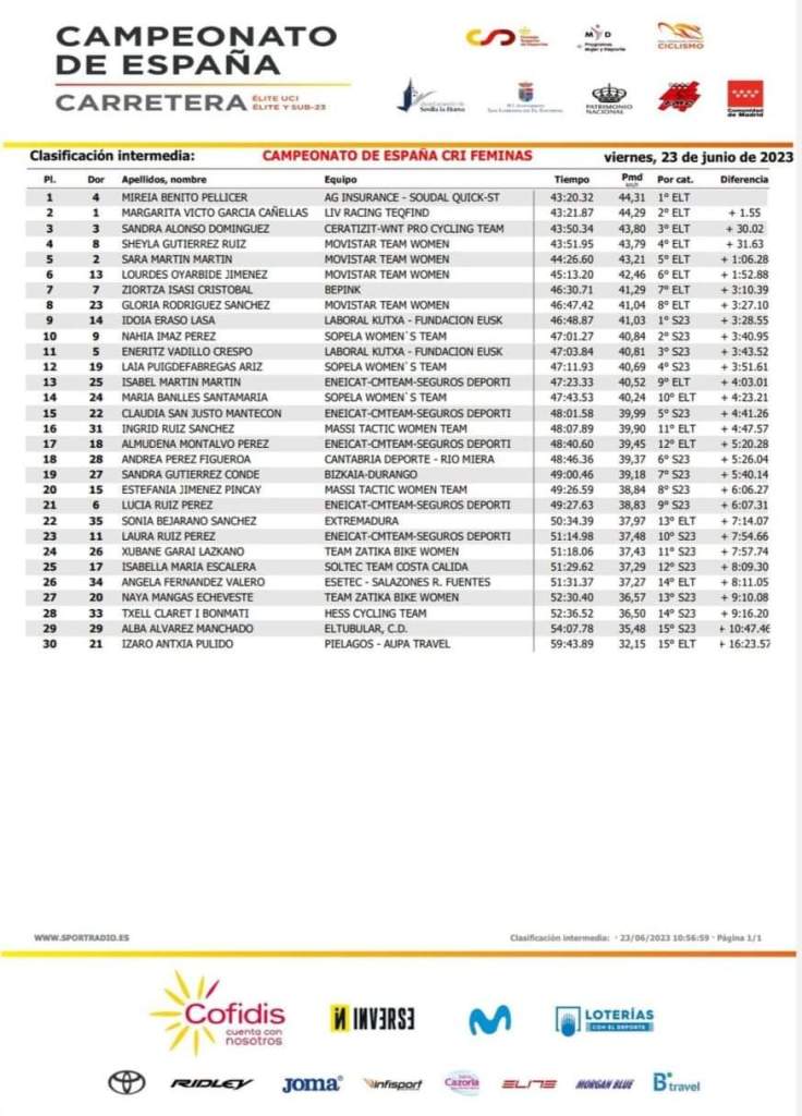 La catalana Mireia Benito se ha proclamado campeona de España de CRI en la prueba disputada esta mañana en la localidad madrileña de Sevilla La Nueva. Tan sólo un segundo le ha separado de Mavi García, que ha terminado segunda. Medalla de bronce para la torrevejense Sandra Alonso, tras una segunda parte de crono espectacular. Marcaba el quinto mejor tiempo en el intermedio. Idoia Eraso ha sido la mejor sub 23 por delante de Nahua Imaz y Enetotz Vadillo.