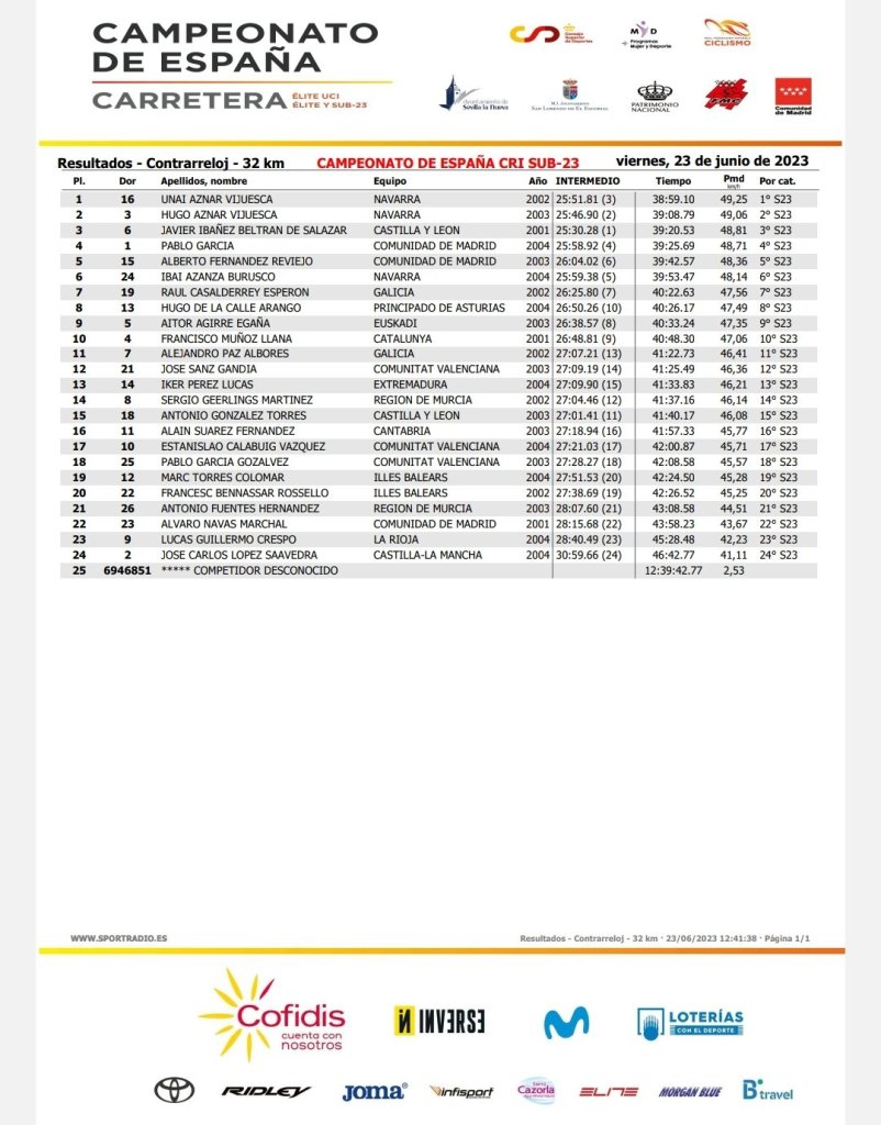Doblete navarro. Unai Aznar (Navarra) es el nuevo campeón de España de la categoría sub 23 en la modalidad de CRI. Hugo Aznar (Navarra) ha sido segundo y Javier Ibáñez (Castilla y León) ha completado el podio. José Sanz (Essax) ha sido mejor de la Selección de la Comunidad Valenciana, en el puesto 12, mientras que Estanislao Calabuig ha finalizado en el puesto 17 y Pablo García, en el 18.