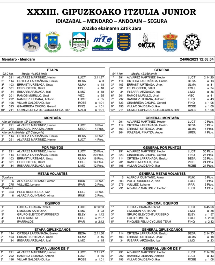Dos de dos. Héctor Álvarez se ha impuesto hoy en la primera etapa de la Gipuzkoako Itzulia. Ayer ganó la crono de la prólogo y hoy se ha impuesto en la de línea con principio y final en Mendaro. Eneko Ortega (Besa) ha terminado segundo y Unax Errasti (Ulma), tercero. Antonio Ramírez (Lucta) ha finalizado séptimo. Además, Álvarez lidera la General y comanda la clasificación de los júniors de primer año, la de los Puntos y el premio de la Montaña. Sin olvidar que su equipo, el Lucta-Grupo Sime es la mejor escuadra de la carrera vasca. Una jornada para enmarcar.