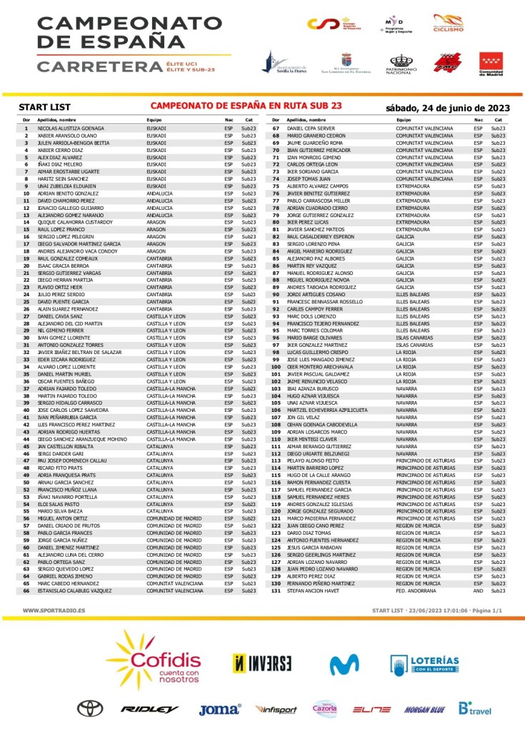 Está previsto que la salida a esta prueba en línea sub23 masculina del Campeonato de España se efectúe a las 16:00 h y que los primeros ciclistas lleguen a meta en torno a las 20:15 h.