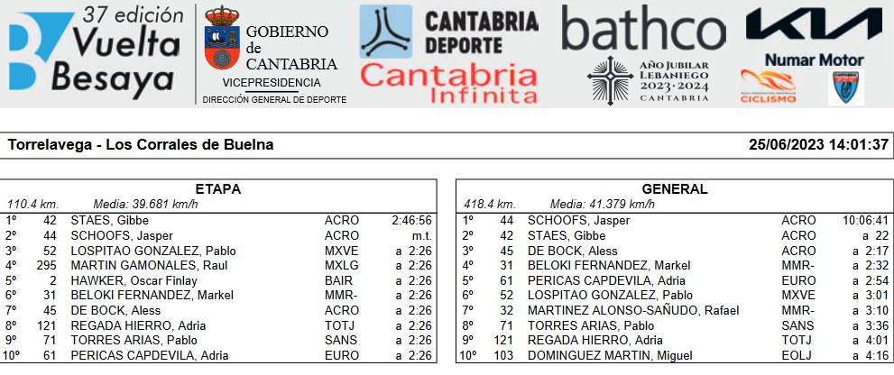 Loss belgas Gibbe Staes y Jasper Schoofs han llegado en solitario a la meta en la última etapa de la Vuelta Besaya con final en Los Corrales de Buelna. Staes se impuso bajo la pancarta y Schoofs logró el triunfo en la general con Staes, segundo y De Bock, tercero. Dominio total del equipo Acrog Tormans. El pelotón llegó hoy a meta a 2:26 encabezado por Pablo Lospitao.