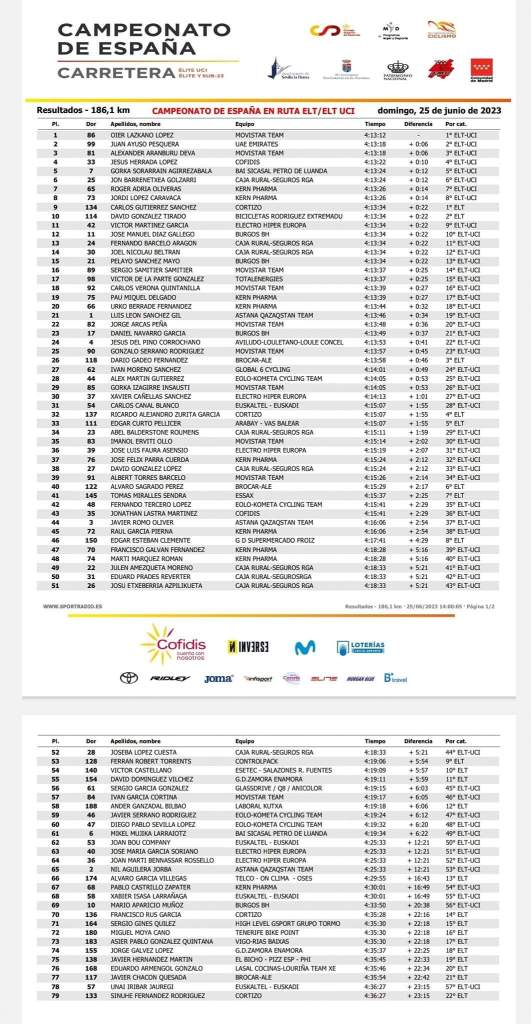 “El último mes y medio he estado 100% concentrado en intentar hacerlo lo mejor posible en los Campeonato de España. El viernes ya me quedé a dos o tres segundos de ganar la crono y con la victoria de hoy estoy muy contento. El equipo ha hecho un trabajo inmenso. Ayer estuve hablando con Pablo Lastras y me pidió que señalará quienes creía que eran favoritos y yo subrayé a todo nuestro equipo. Quizá no teníamos un talento con tantos quilates como Ayuso, pero sabíamos que teníamos mucha calidad y que estando en todos los cortes lo podíamos conseguir y así ha sido”, ha comentado Lazkano tras hacerse con la victoria.