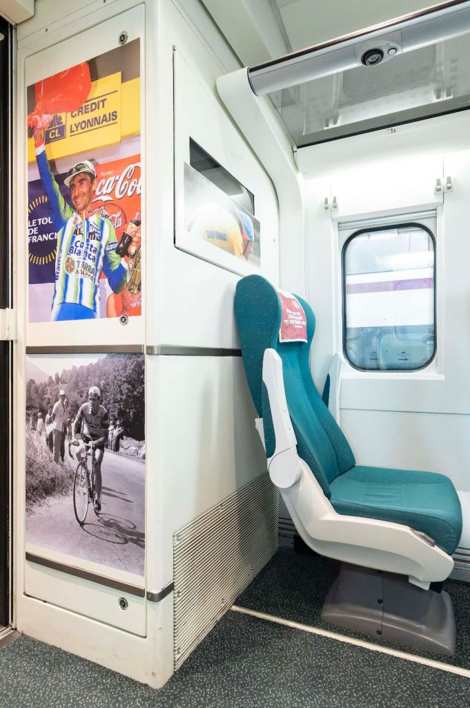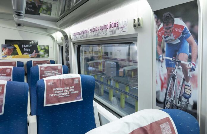 Renfe expone una selección de fotografías del mundo del ciclismo en el interior de un tren Alvia Madrid-Bilbao con motivo del 120 aniversario del nacimiento del Tour de Francia y que este año se inicia en Bilbao. La muestra, que lleva por título ‘Campeones eternos, sueños cumplidos’ es un tributo a los siete ciclistas españoles ganadores de la competición francesa y a los 11 ciclistas que han subido al podio desde el inicio de la prueba. Con esta exposición, que coincide con la futura puesta en marcha de los servicios AVE en Francia, Renfe quiere rendir homenaje a los ciclistas que a lo largo de la historia han ganado el Tour: Federico Martín Bahamontes (1959), Luis Ocaña (1973), Pedro Delgado (1988), Miguel Induráin (1991,1992, 1993, 1994 y 1995), Óscar Pereiro (2006), Carlos Sastre (2008) y Alberto Contador (2007 y 2009). Pero también a los que lograron subirse al pódium durante estos años: Bernardo Ruiz (tercero en 1952), Bahamontes (que fue segundo en 1963 y tercero en 1964), José Pérez Francés (tercero en 1963), Julio Jiménez (segundo en 1967), José Manuel Fuente (tercero en 1973), Vicente López-Carril (tercero en 1974), Ángel Arroyo (segundo en 1983), Fernando Escartín (tercero en el año 1999), Joseba Beloki (tercero en 2000 y 2001 y segundo en 2002), Samuel Sánchez (segundo en 2010), Purito Rodríguez (tercero en 2013) y Alejandro Valverde (tercero en 2015).