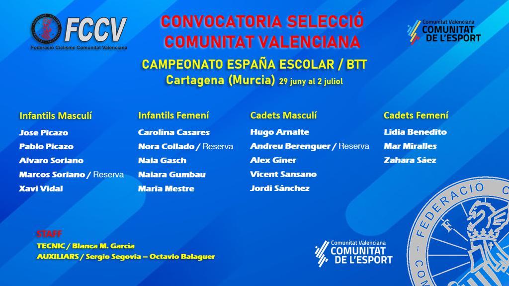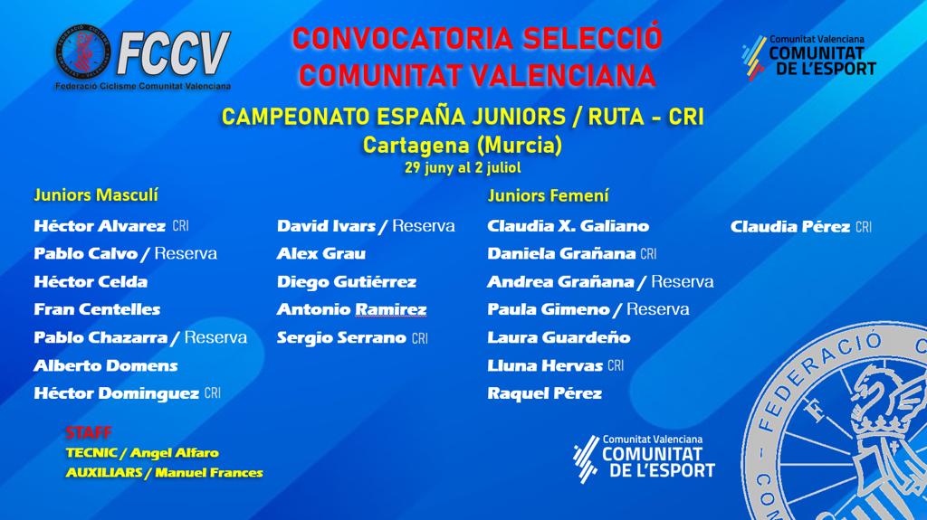 Cartagena será escenario del jueves 29 de junio al domingo 2 de julio de la celebración de los Campeonatos de España Escolares y Junior de carretera. Los mejores corredores infantiles (13 y 14 años), cadetes (15 y 16 años) y juniors (17 y 18 años) de nuestro país lucharán por los distintos títulos nacionales de sus respectivas categorías. Las distintas selecciones de la Comunidad Valenciana ya cuentan la horas. Todo está preparado y los maillots rojigualdos esperan a los ciclistas de la FCCV. El trabajo de preparación de Ángel Alfaro, Blanca García y Ariadna Rambla ya está hecho.
