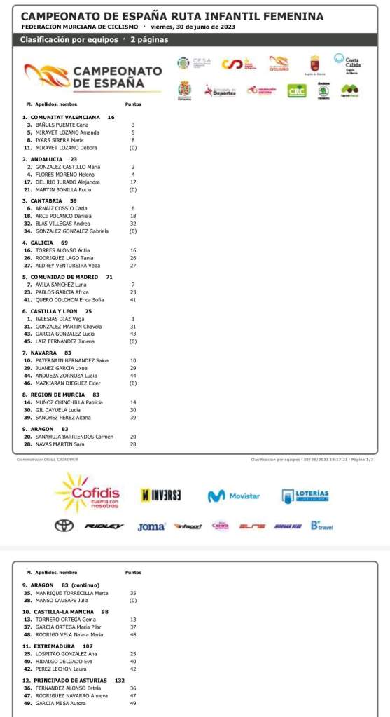 Vega Iglesias (Castilla y León) se ha proclamado esta tarde en Cartagena campeona de España de la categoría Infantil. María González (Andalucía) y Carla Bañuls ha conseguido la medalla de bronce para la FCCV y completa el podio. El título se ha decido al esprint. Amanda Miravet ha terminado quinta; María Ivars, octava; y Débora Miravet, undécima. Gran actuación de las pupilas de Ariadna Rambla que han logrado la primera posición por escuadras