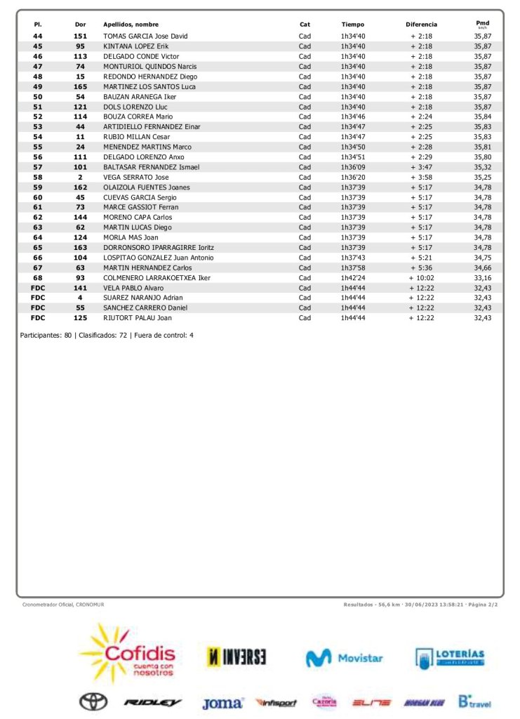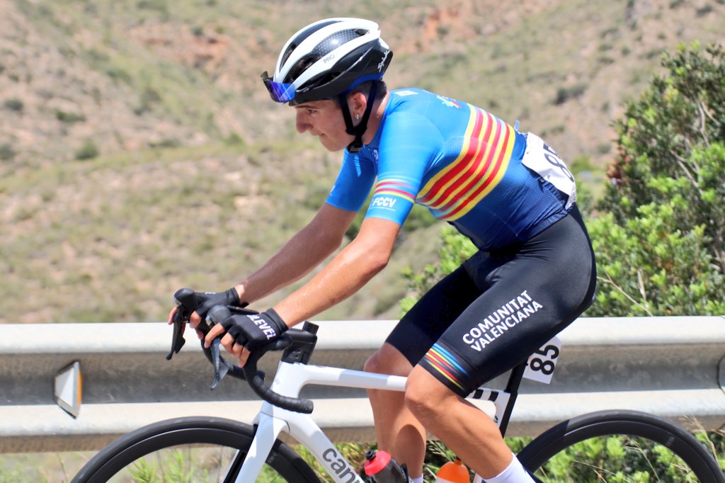 Aitor Arlandis ha sido uno de los protagonistas de la carrera. El corredor de la FCCV se ha ido con Salvador García y tras coronar el alto de la Cuesta su diferencia era de 1’05» respecto al pelotón. Arlandis ha insistido en su empeño y al final se ha quedado solo en cabeza hasta que han llegado sus compañeros que con él en fuga han viajado en butaca.