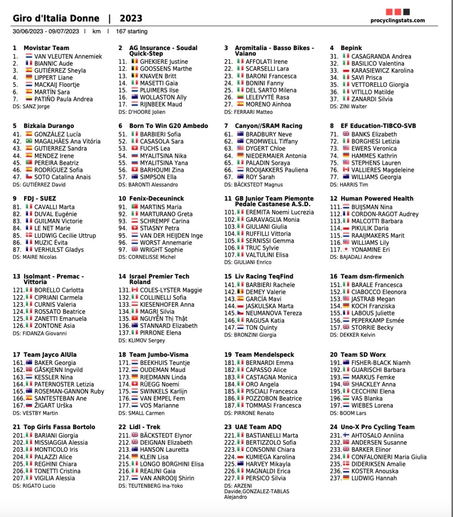 El Giro Donne 2023 parte hoy, viernes 30 de junio, de Chianciano Terme (SI) y finalizará en Olbia (SS) el domingo 9 de julio. Tomarán la salida total de 167 ciclistas de 29 nacionalidades distintas y pertenecientes a 24 escuadras. Entre las participantes está la valenciana Sofía Ródriguez (Bizkaia Durango), que afronta su segunda prueba transalpina.