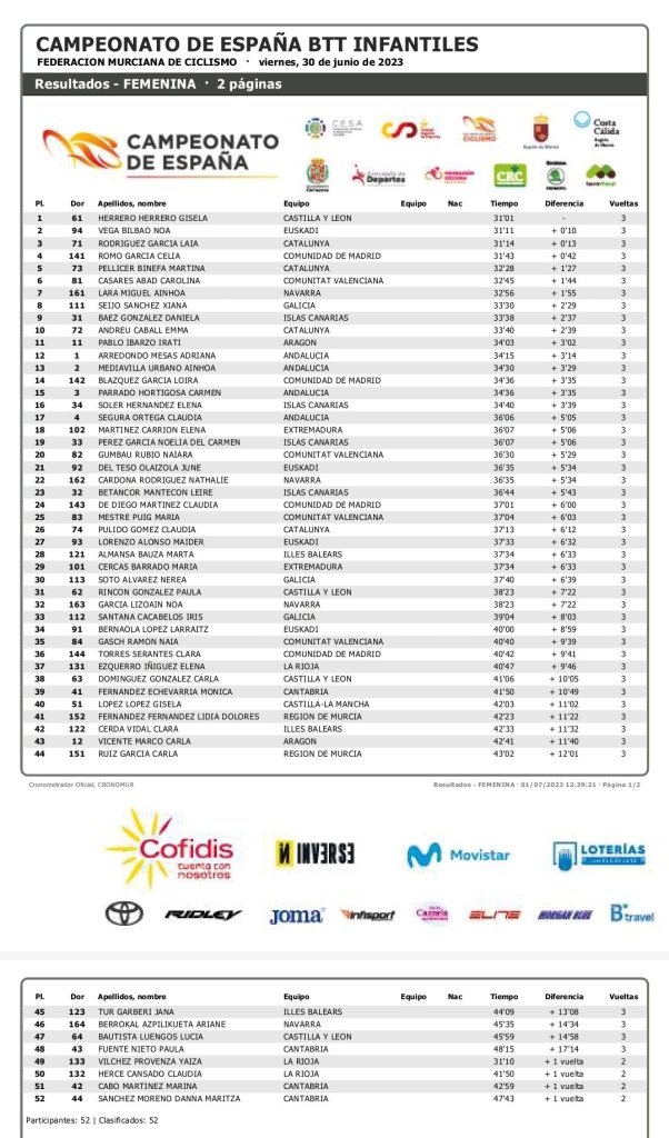 Gisela Herrero (Castilla y León) se lleva la victoria en la categoría infantil femenina de BTT en el Campeonato de España Escolar que se está celebrando en Cartagena. Noa Vega (Euskadi) ha sido segunda y Laia Rodríguez (Cataluña), tercera. Carolina Casares ha ocupado el puesto sexto; Naiara Gumbau, el 20; María Mestre, el 25; Naia Gasch, el 35.