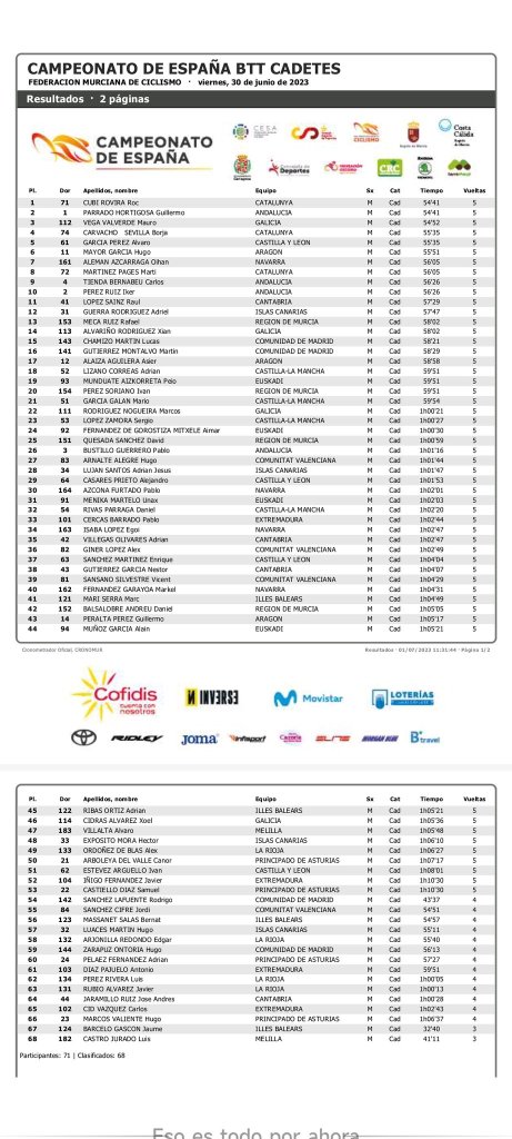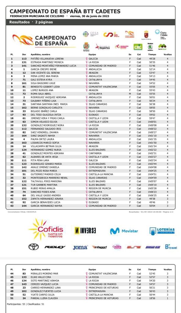 La gallega Lorena Patiño ha revalidado esta mañana en Cartagena su título de campeona de España cadete XCO. La riojana Mónica Estrada ha sido segunda y la madrileña Lucía Sánchez, tercera. Novena plaza para Lidia Benedito, mientras que Zahara Sáez ha entrado en el puesto 22 y Mar Miralles, en el 44.