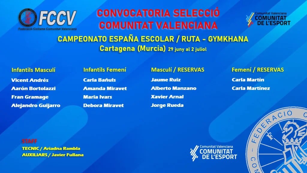 Finalizados los Campeonatos de España Escolares y Júniors disputados en Cartagena llega la hora del balance. En la categoría Infantil la actuación de los chicos y chicas de la FCCV, con Ariadna Rambla como seleccionadora, ha sido de nota. En las pruebas en líneas se proclamaron campeonas por escuadras y a nivel individual Carla Bañuls y Vicente Andrés se colgaron el bronce tras sendos esprints. Un buen comienzo que tuvo su culminación en las Gymkanas una jornada después. Carla Bañuls conseguía el título de campeona de España, la Selección femenina de la Comunidad lograba la plata y Fran Gramage el bronce. En suma, tres medallas de oro, una de plata y otras tres de bronce. «Ha sido mi primer campeonato como seleccionadora y no hay palabras para expresar esta vivencia y compartir con 8 ciclistas una experiencia que seguro que no olvidarán/olvidaremos nunca», señalaba Ariadna antes de realizar esta reflexión: «Estos chicos han conseguido triunfar, sí, y más allá del éxito deportivo les he visto progresar y evolucionar desde el inicio del año en un crecimiento personal y ciclista. Mostrando ganas, sacrificio e ilusión. Y al final cuando hay trabajo y aprendizaje todo se alcanza. En estos campeonatos han sabido escuchar cada detalle y cada consejo. También la unión ha resultado imprescindible para el buen funcionamiento individual y colectivo. Esto es también parte del éxito el disfrutar del viaje hasta llegar a la parada final. Gracias a mi grupito por ser una selección ejemplar en la competición y fuera de ella».