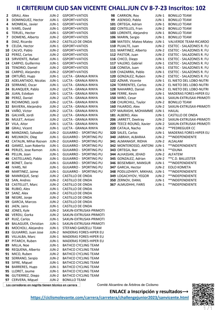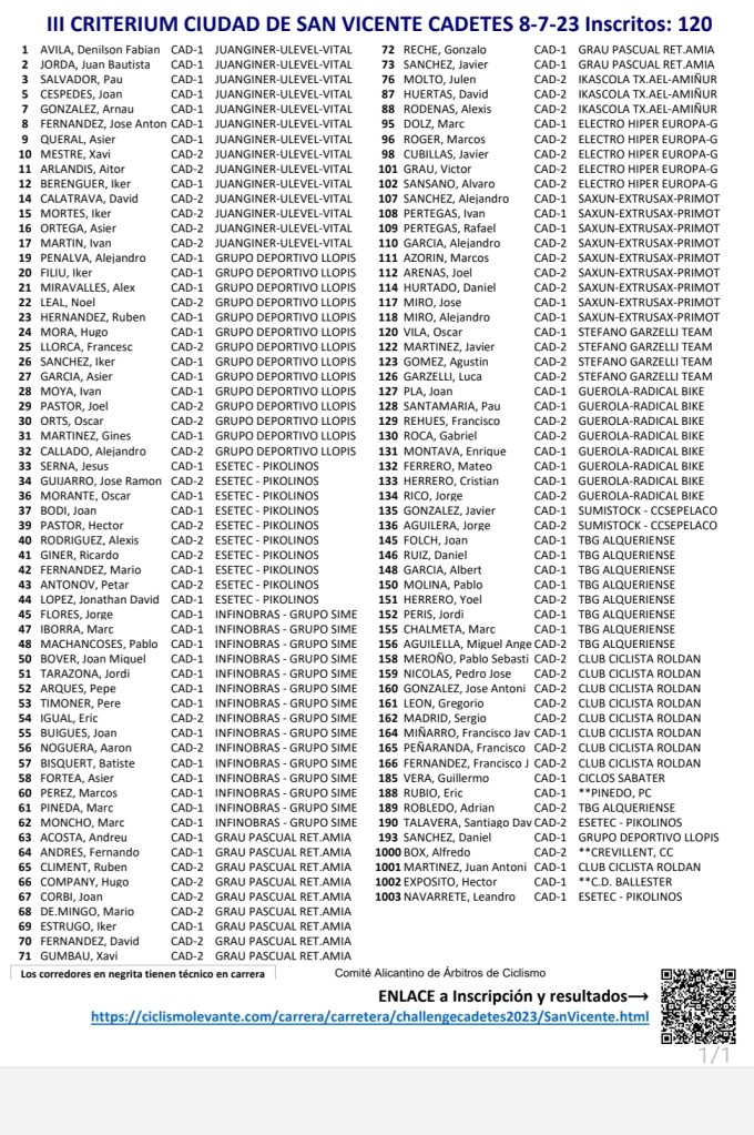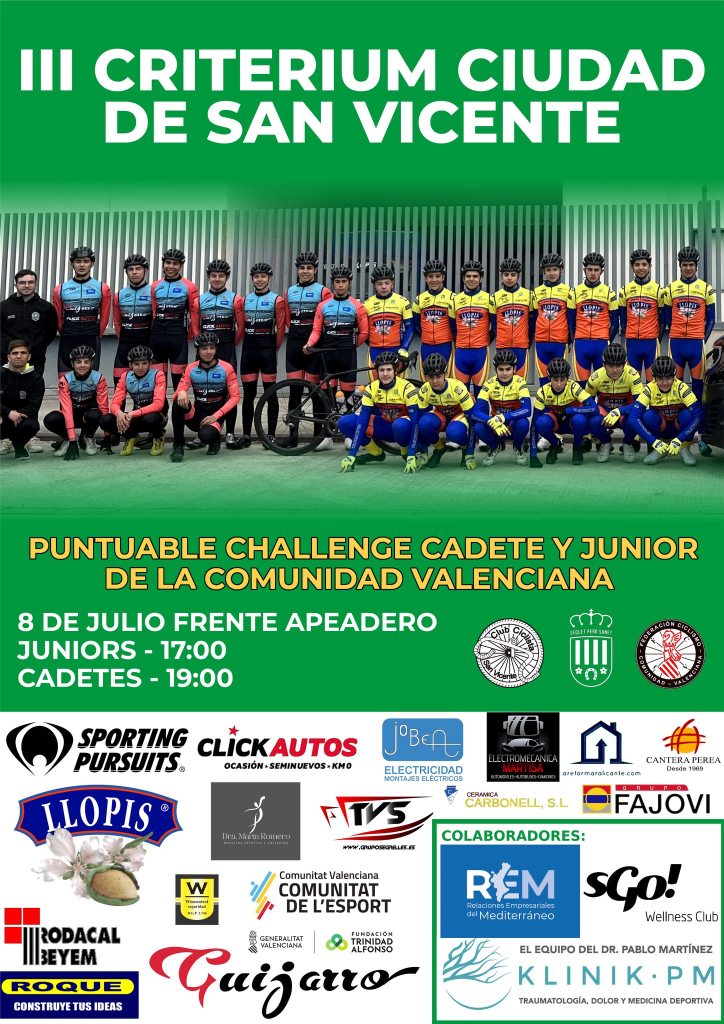 El próximo sabado, día 8 de julio, se disputa el III Criterium «Ciudad de San Vicente» para corredores cadetes y júniors. Ambas pruebas son valederas para las Challenges de la Comunidad Valenciana. Los júniors comenzarán a las 17 horas y Taylor Churchill (Bonillo) lidera dicha clasificación. Hay 102 inscritos. Por su parte, Mario de Mingo (Grau Pascual) comanda la cadete. La carrera de sábado se iniciará a las 19 horas con 120 inscritos.
