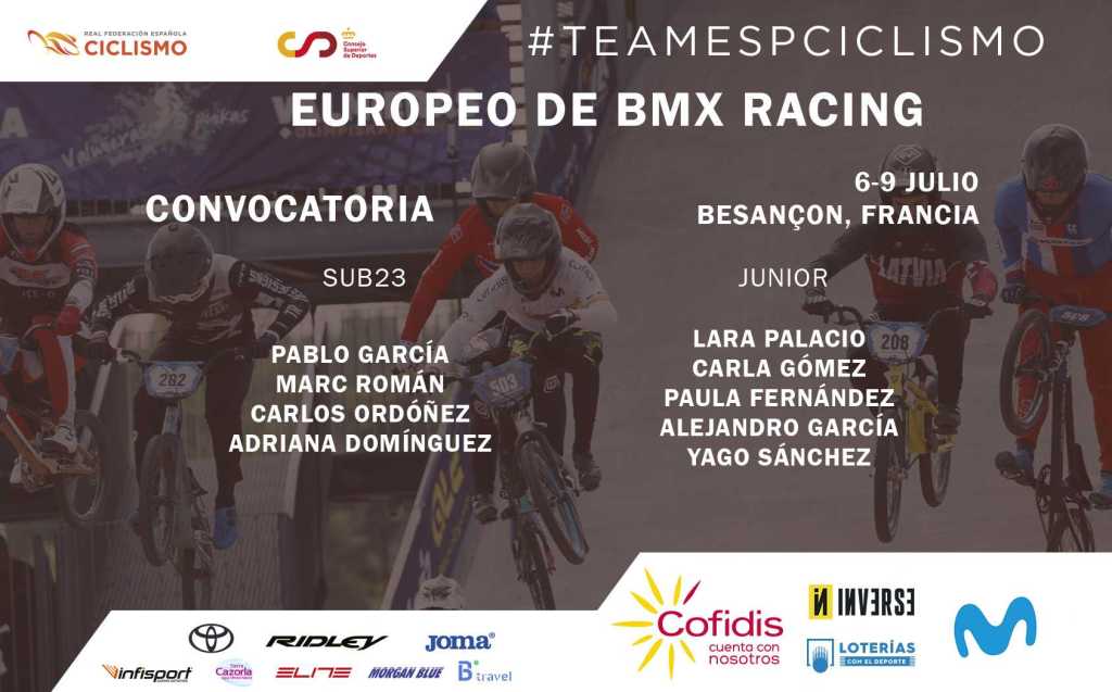 Nueve pilotos de BMX Racing representarán a la Selección Española en el Campeonato de Europa de la modalidad que se disputará del 6 al 9 de julio en la localidad francesa de Besançon. El seleccionador nacional Alejandro Alcojor ha convocado para la cita al núcleo del grupo de trabajo que viene compitiendo a nivel internacional en las últimas fechas con buenas sensaciones. Un equipo en el que figura el alicantino Carlos Ordóñez. Junto a él estarán los sub 23 Pablo García, Marc Román y Adriana Domínguez y los júnior Alejandro García, Yago Sánchez, Paula Fernández, Carla Gómez y Lara Palacio.