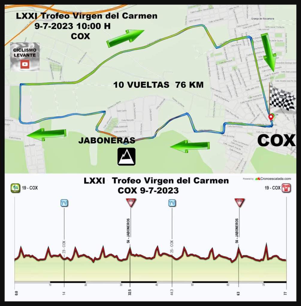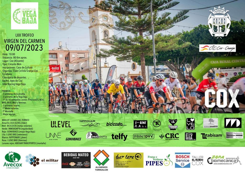 El domingo, día 9 de julio, se disputa en Cox el LXX Trofeo Virgen del Carmen. La penúltima prueba del Interclub Vega Baja discurrirá en un circuito cercano a los 8 kilómetros al que se darán diez vueltas hasta completar los 76 previstos por Club Ciclista Granja-Cox para la jornada. El banderazo de salida se dará a las 10 horas.