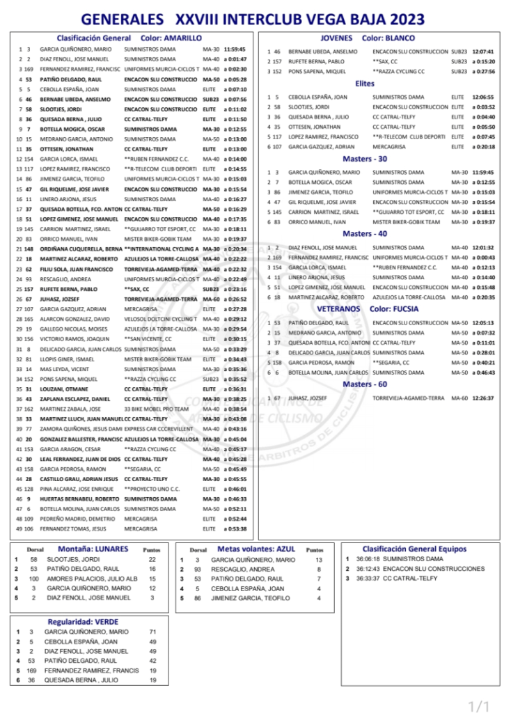 Mario García Quiñonero (Suministros Dama) comanda la general del Torneo por delante de José Manuel Díaz Fenoll (Suministros Dama) y Francisco Fernández (Uniformes Murcia). El líder lleva 1.47 de ventaja a su compañero y 2.30 sobre el tercer clasificado. Además, también está al frente de la clasificación de las metas volantes y de la regularidad. El Suministros Dama es la mejor escuadra y Jordi Slootjes porta el maillot de la montaña.