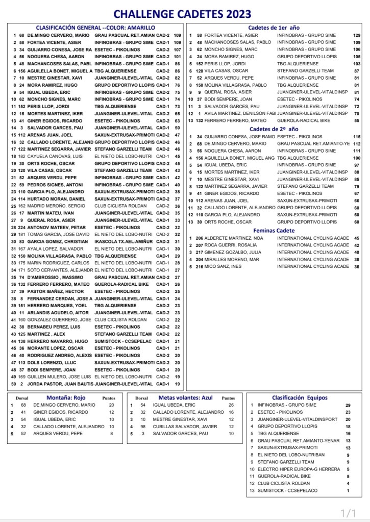 Mario de Mingo (Grau Pascual) sigue de líder de la Challenge Cadete de la CV. Asier Fortea (Infinobras Grupo Sime) es segundo y José Ramón Guijarro (Esetec Pikolinos), tercero. En Féminas, Noa Alderete es la mejor. De Mingo lleva también el maillot de la montaña; Eric Igual, el de las Metas Volantes; y el Infinobras-Grupo Sime lidera la clasificación de escuadras.