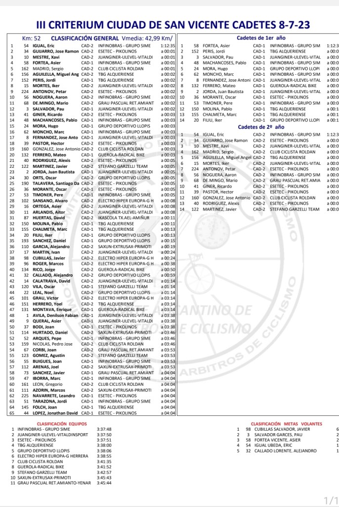 Eric Igual (Infinobras-Grupo Sime) ha sido el vencedor del III Critérium Ciudad de San Vicente de la categoría cadete. José Ramón Guijarro (Esetec Pikolinos) ha entrado a continuación y Xavi Mestre (Juanginer Ulevel Vitaldinsport) termina tercero. El Infinobras-Grupo Sime ha sido la mejor escuadra y Javier Cubillas se ha adjudicado las metas volantes.