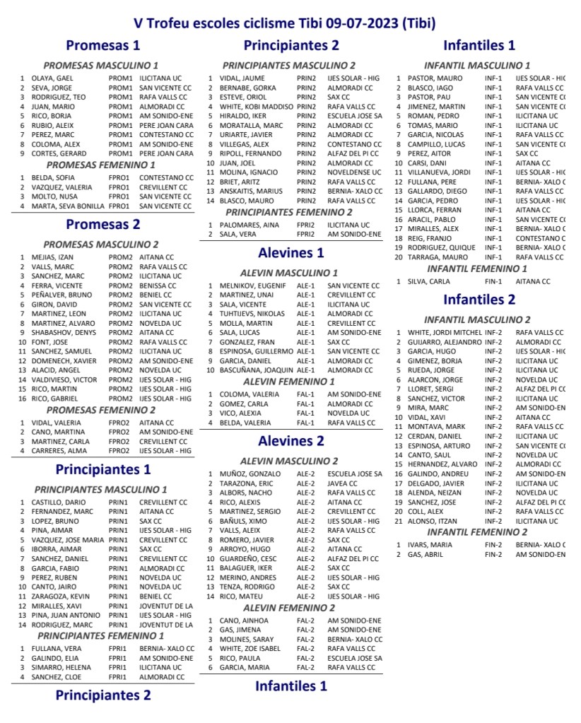 En la categoría Promesas 1, la victoria ha sido para Gael Olaya (UC Ilicitana) y Sofía Belda (Contestano); Izan Mejías (Aitana) y Valeria Vidal (Aitana) se han impuesto en Promesas 2; Darío Castillo (Crevillent) y Vera Fullana (Bernia Xaló), en Principiantes 1; Jaume Vidal (Ijes Solar) y Aina Palomares (UC Ilicitana), en Principiantes 2; Eugenif Melnikov (CC San l) y Valeria Coloma (AM Sonido), en Alevines 1; Gonzalo Muñoz (Sabater) y Ainhoa Cano (AM Sonido), en Alevines 2; Mauro Pastor (Ijes Solar) y Carla Silva (Aitana), en Infantiles 1; y Jordi Mitchel White (Rafa Valls) y María Ivars (Bernia Xaló), en Infantiles 2.
