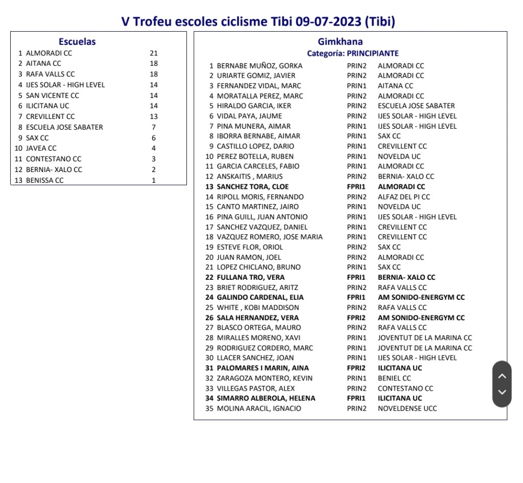 En Gymkana, de la categoría de Principiantes, Gorka Bernabé (Almoradí) ha sido el ganador. Marc Fernández (Aitana) y Cloe Sánchez (Almoradí) han sido los mejores Principiantes 1, y Bernabé y Vera Sala (AM Sonido), se han impuesto en Principiantes 2.