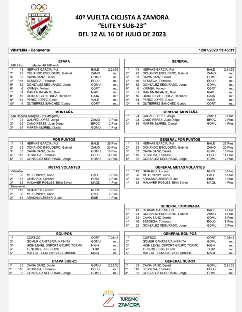 En el acto de entrega de maillots estuvieron presentes Beatriz Asensio, alcaldesa de Benavente, y Elena Justo, concejala de Feportes, así como José Manuel Salvador, diputado de Comarca, Primitivo Santos, director de Caja Rural Zamora, Mateo García, responsable de Lácteas Cobreros y Gloria Lorenzo, representante de Grupo CT. El ganador del día, Pol Hervás, acaparó la mayoría de los aplausos al recibir el maillot amarillo de líder de la Diputación de Zamora, el azul de la regularidad de Lácteas Cobreros y el blanco de la combinada de Grupo CT. El blanco y rojo del Hotel Casa Aurelia era para Jorge Gálvez, primer ciclista en pasar por ese alto de Dehesa Mangas, mientras que el verde de las metas volantes de Caja Rural Zamora se lo enfundaba Lorenzo Ghirardi y el rojo y negro de Moralejo Selección quedaba en propiedad de Daniel Cavia como mejor joven. Además, el premio de la combatividad-Honza era para Conn McDunphy, el de mejor zamorano para Diego García (Zamora Enamora) y el mejor equipo del día, premio otorgado por Grupo Ibereólicas Renovables, acababa siendo el CC Padronés Cortizo.