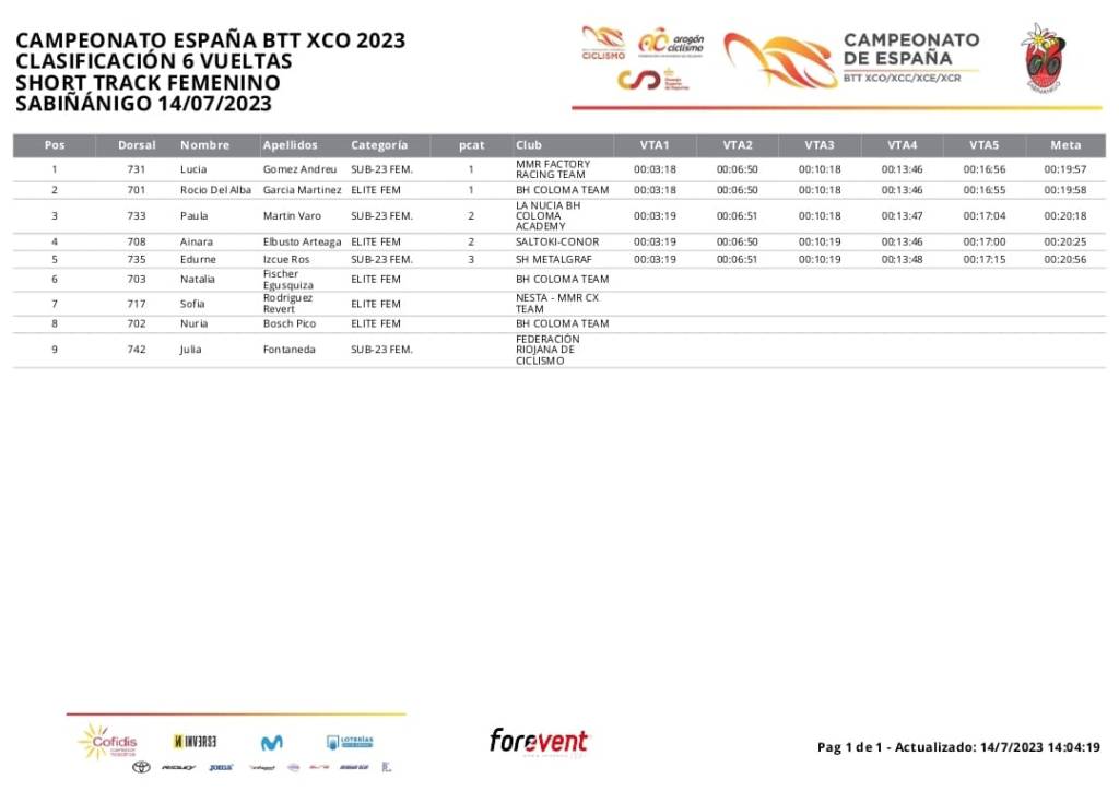 En la categoría femenina, Lucía Gómez (MMR Factory) ha sido la vencedora, con Rocío del Alba García (BH Coloma), segunda y Paula Martín (La Nucía), tercera. Séptima plaza para Sofía Rodríguez (Nesta).