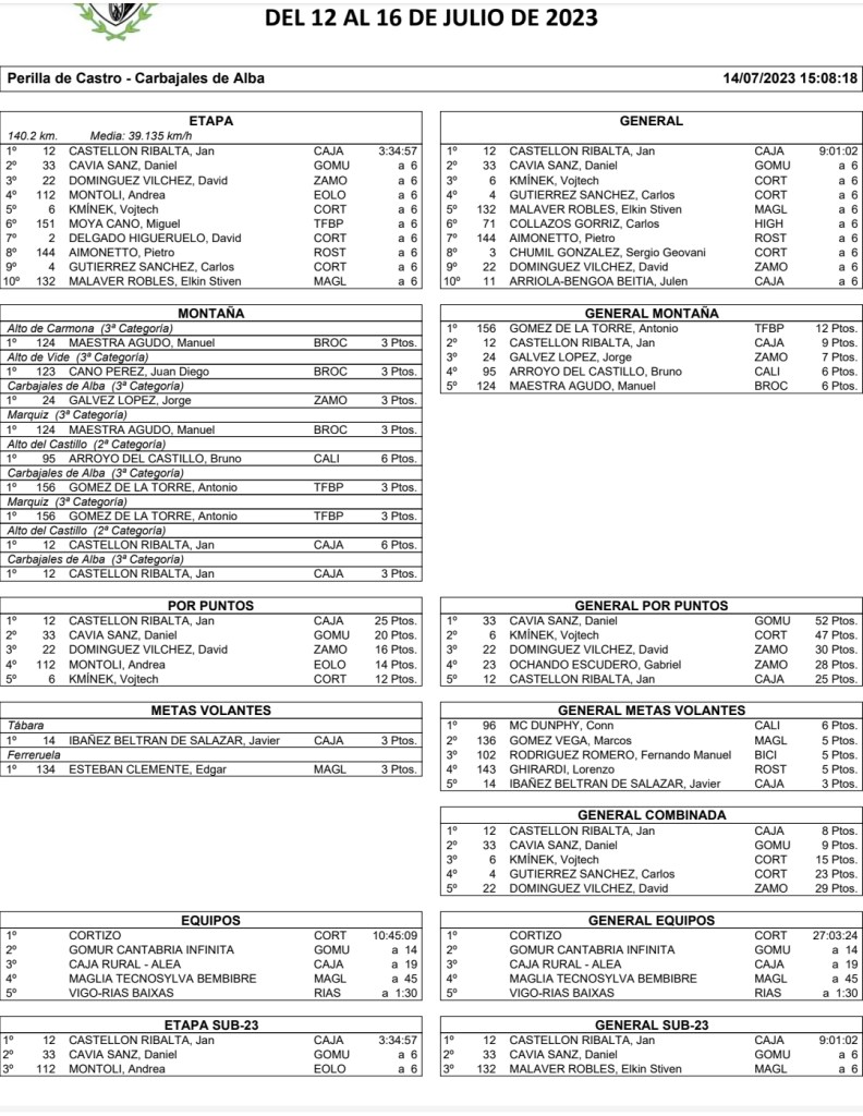 Justo en el momento que el del Cortizo era alcanzado, se movía Castellón, con un durísimo ataque en los porcentajes más empinados del alto del Castillo. El del Caja Rural-Alea coronaba con 15 segundos, que le acabarían valiendo para vencer en Carbajales de Alba y vestirse como nuevo líder. A escasos 6 segundos cruzaba la línea de meta el grupo de favoritos con el hasta hoy líder, Daniel Cavia (Gomur-Cantabria Infinita) en segundo lugar y con David Domínguez, del equipo local Zamora Enamora, completando el podio del día.