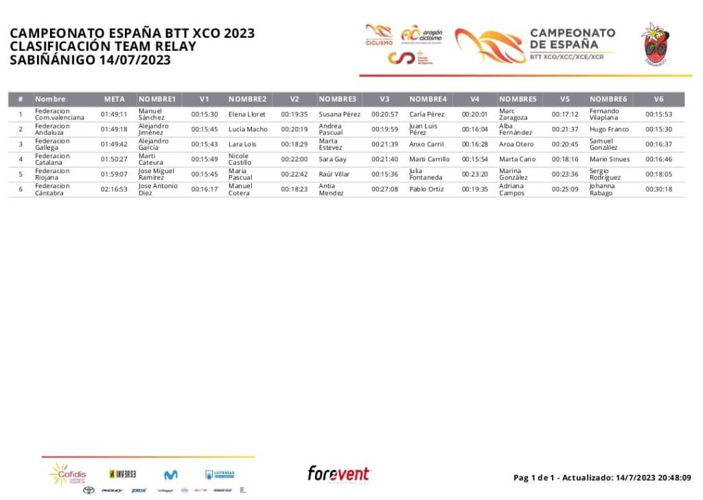 La Federación de Ciclismo de la Comunidad Valenciana se ha proclamado esta tarde en Sabiñánigo campeón de España de Team Relay tras un final muy emocionante. La Federación Andaluza de Ciclismo ha sido segunda y la Gallega ha completado el podio. Elena Lloret, Carla Pérez, Manuel Sánchez Aldeguer, Marc Zaragoza, Susana Pérez y Fernando Vilaplana han sido los competidores de la FCCV.