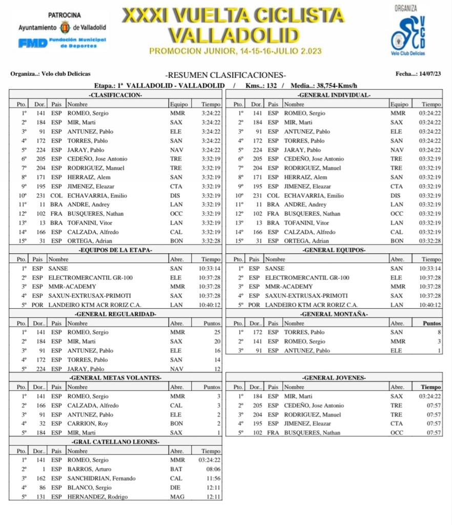 Sergio Romeo (MMR-Academy) se ha impuesto en la primera etapa de la XXXI Vuelta Ciclista a Valladolid que ha tenido salida y meta en la capital pucelana tras 132 kilómetros de recorrido. El tiempo del ganador ha sido de 3:24:22. A su lado ha entrado el corredor del Saxun Extrusax Primoti, Martí Mir, además de Pablo Antúnez (ELE), Pablo Torres (Sanse) y Pablo Jaray (NAV). José Antonio Cedeño (TRE) ha sado tiempo al grueso del pelotón a casi ocho minutos. Romeo es el primer líder y Martí el mejor júnior de primer año.