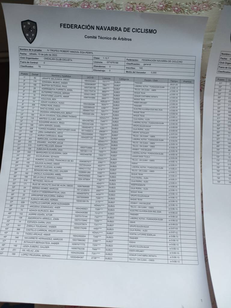 El V Trofeo Electricidad Robert Innova comenzó con un intenso ritmo y fuerte viento que hacían que los ataques no cuajaran. A partir de los treinta kilómetros, una escapada de quince corredores donde se encontraba Daniel Artero intentó probar suerte, pero fueron neutralizados por un grupo principal reducido a veinte unidades antes de comenzar la ascensión al Alto de Lezaun. En ese grupo, los farmacéuticos Diego Uriarte, Hugo Aznar y Abel Rosado hicieron una exigente subida. Entonces, Uriarte realizó un ataque en la bajada al que nadie pudo responder y que acabó otorgándole su segundo triunfo de la temporada tras Ontur . “La valoración es muy positiva. Diego y sus compañeros han demostrado el gran nivel y rendimiento que tiene el bloque. Han corrido como equipo siendo superiores y cubriendo los ataques decisivos”, explica Sergio Araiz, director deportivo del Equipo Finisher. “Una victoria siempre es motivo para estar muy contento y que valida las buenas sensaciones que tenía tras campeonatos”, explica Diego Uriarte, el protagonista del día. “Ha sido un día con mucho viento que lo ha hecho muy duro, pero hemos sabido gestionar la carrera. Lo probé en la bajada final y me marché solo hacia meta donde pude disfrutar el triunfo”, asegura el ciclista del Equipo Finisher.