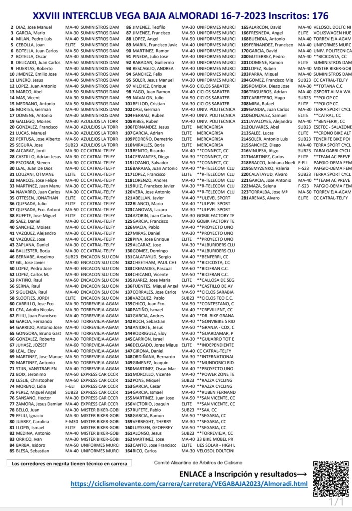 El XXVIII Interclub Vega Baja 2023 toca a su fin el domingo, día 16 de julio, con la disputa del XXIV Trofeo Villa de Almoradí. El banderazo de salida se dará a las 10 horas y el pelotón deberá recorrer 75 kilómetros. La lista de inscritos es de 176 corredores.