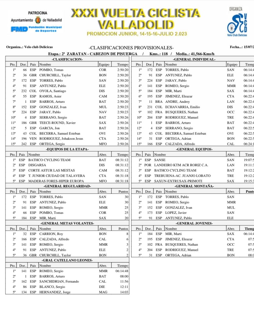 Tomás Pombo (Cortizo) ha sido hoy el vencedor de la segunda etapa de la XXXI Vuelta Ciclista Valladolid Promoción Júnior que ha comenzado en Zaratán y ha terminado en Cabezón de Pisuerga, tras 118 kilómetros de recorrido. Taylor Churchill (Bonillo Team) y Pablo Torres (Sanse) han completado el podio de la jornada. Torres sigue de líder y Martí, que es quinto, lidera la clasificación de los júniors de primer año.
