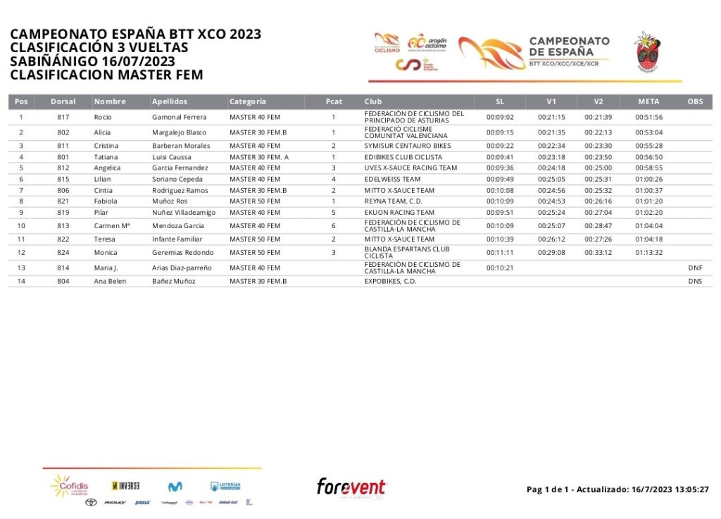 En Máster 30B, Alicia Margalejo (FCCV), medalla de oro. En máster 40, el título cayó del lado de Rocío Gamonal, por delante de Cristina Barberán y Angélica García. En máster 50, la ganadora fue Fabiola Muñoz, con la plata para Teresa Infante y el bronce para Mónica Geremías. «Estoy muy contenta tras ganar el maillot rojigualdo. Me sentí muy bien y segura de mí misma durante la carrera, disfrutando el circuitazo de Sabiñánigo», señalaba Alicia mientras mordía su medalla de oro.
