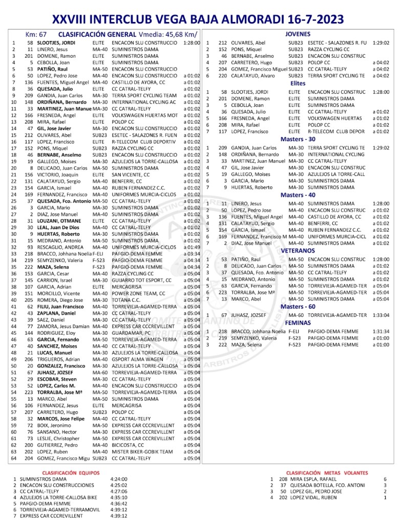 Jordi Slootjes ha vencido entre los élites; Abel Olivares (Esetec Salazones Ricardo Fuentes) ha sido el mejor joven; Juan Carlos Gandía (Terra Sport) vence en M30; Linero, en M40; Raúl Patiño (Encacon), en M50; Jozsef Juhasz (Torrevieja), en M60; y Johhana Noelia Bracco (Pafgio), en féminas. Rafael Mira se ha llevado las MV y el Suministros Dama ha sido la mejor escuadra.
