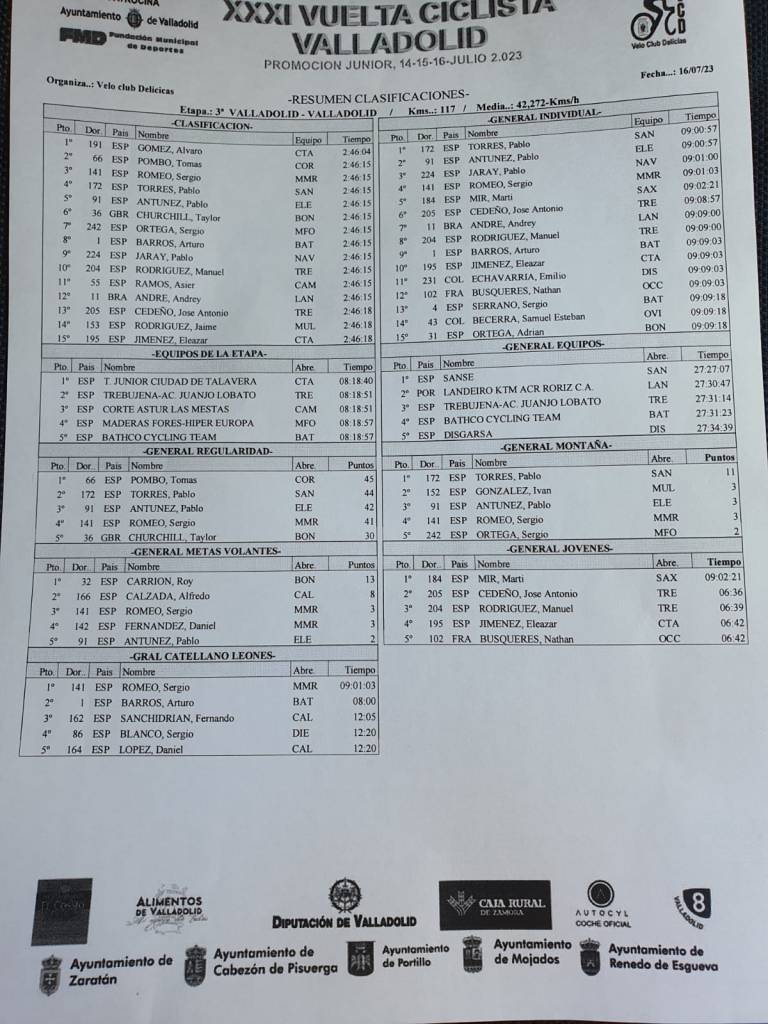 Álvaro Gómez se ha adjudicado hoy la última etapa de la XXXVI Vuelta Ciclista a Valladolid. Pablo Torres (Sanse) se ha llevado la general. Martí Mir (Saxun-Extrusax-Primoti) se ha adjudicado el maillot azul como mejor júnior de primer año.