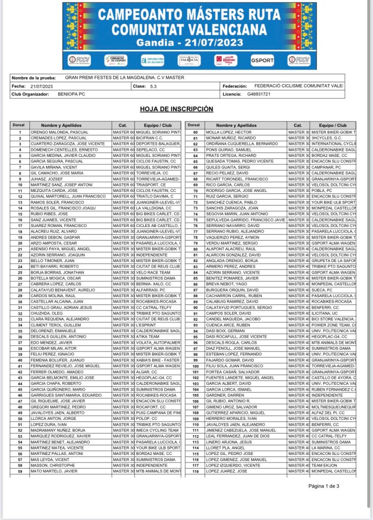 El concejal de Deportes de Gandia, Jesús Naveiro, acompañado por el director de la carrera, Sergio Camarena, y el presidente de la Penya Ciclista Beniopa, Pascual Orengo, presentaron el Campeonato de Ciclismo Máster 30, 40, 50 y 60 de la Comunitat Valenciana, que se disputará hoy viernes, 21 de julio, a partir de las 17.30 horas, con inicio y final en la calle Parpalló. Se han inscrito 187 corredores.