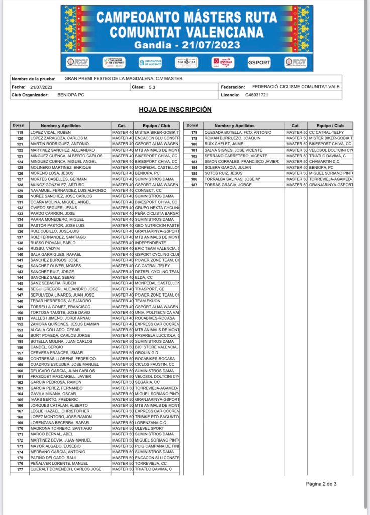 San Miguel de Salinas acogió la edición de 2022 que vistió con el maillot de campeones a Antonio Domene ( Suministros Dama), en M30; Pedro José López ( Yourbike), en M40; Fernando Gimeno (JuanGiner), en M50; y Ernesto Domenech (Sepelaco), en M60.