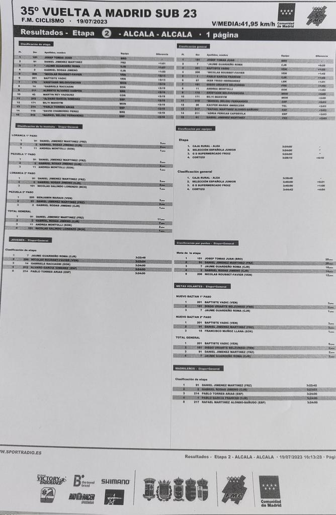 Josep Tomàs (Brocar Alé) ha sido el vencedor de la segunda etapa de la Vuelta Ciclista a Madrid 2023 que ha tenido principio y final en Alcalá de Henares, con 139,90 kilómetros de recorrido. Además, el alicantino se ha vestido de líder. Impresionantes sus últimos kilómetros. Dani Jiménez (Froiz) ha entrado segundo, a casi un minuto, y Jaume Guardeño (Filial Caja Rural), tercero. El alteano sigue siendo el primer joven y segundo en la general, a 19 segundos del líder.