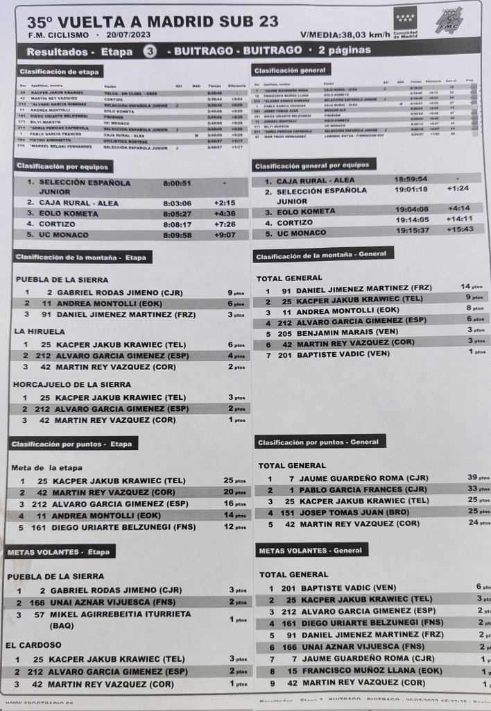 Kacper Krawiec (Telco’m-ON Clima-Osès), se ha adjudicado la tercera etapa de la Vuelta Ciclista a Madrid Sub 23 quen ha tenido principio y fin en Buitrago de Lozoya, con un recorrido corto de poco más de 100 kilómetros. Martín Rey (CC Padronés-Cortizo) ha sido segundo y la tercera plaza la ha ocupado el júnior Álvaro García (Selección Española). A casi minuto y medio llegaba lo que quedaba del grupo de favoritos con el alicantino Jaume Guardeño recuperando el liderato de la prueba madrileña para el filial del Caja Rural-Alea, ya que Josep Tomàs (Brocar Alé) se dejaba casi dos minutos y medio con respecto al ganador. En la General, Francisco Muñoz (Eolo) está a 15 segundos y Álvaro García, a 24, a falta de dos jornadas.