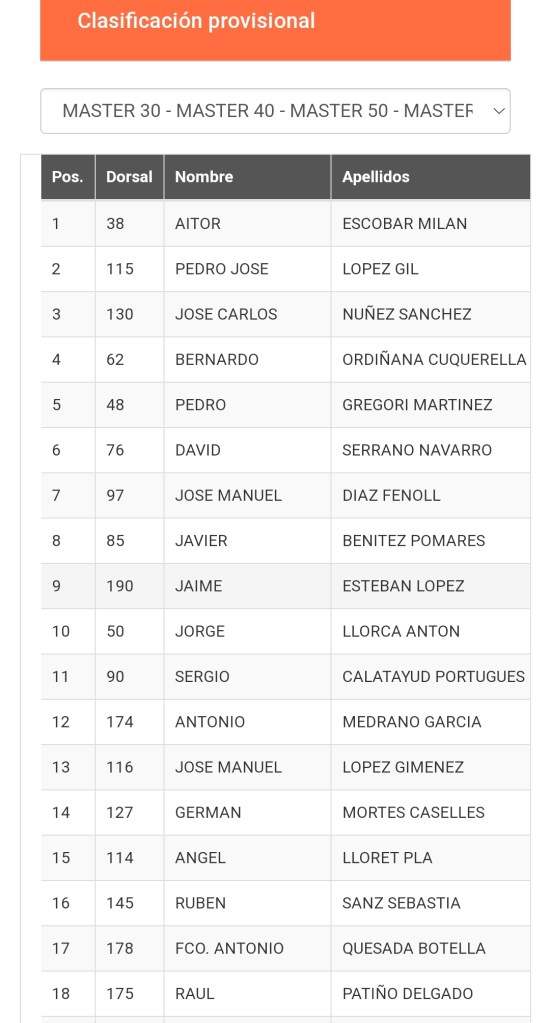 | 3 | 97 | JOSE MANUEL | DIAZ FENOLL | SUMINISTROS DAMA | 00:00:00.000 |