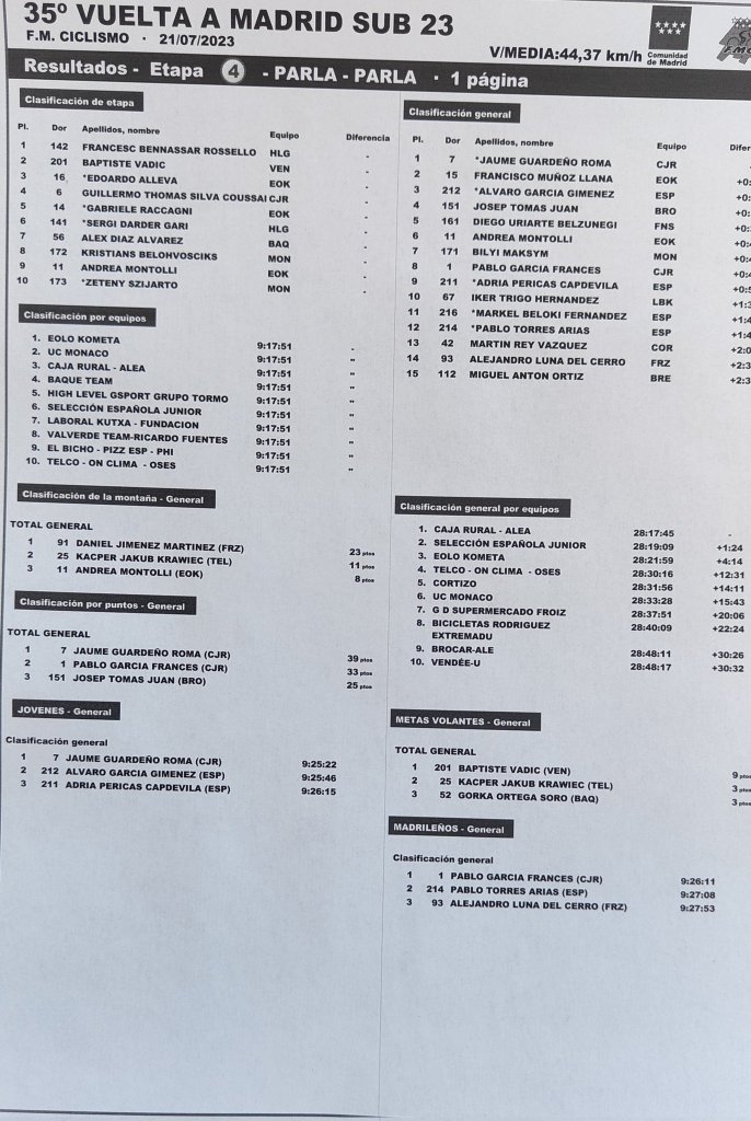 Guardeño lidera el premio de la Regularidad y posee también el maillot amarillo de primer joven. «A priori era la etapa más cómoda, pero ha sido complicada porque hay mucho nivel. El equipo ha trabajado bien y esperamos mañana, en la última jornada, mantener el maillot rojo de vencedor de la Vuelta a Madrid», señala el corredor alteano.
