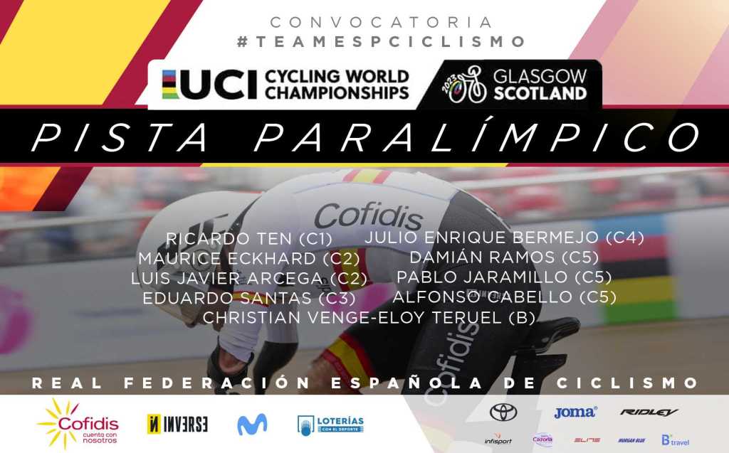 De cara al Mundial de Ciclismo Paralímpico en Pista, la Selección Española, la cual también dirige Félix García Casas, estará integrada por nueve ciclistas: Ricardo Ten (C1), Maurice Ekchard (C2), Luis Javier Arcega (C2), Eduardo Santas (C3), Julio Enrique Bermejo (C4), Damián Ramos (C5), Pablo Jaramillo (C5), Alfonso Cabello (C5) y Christian Venge-Eloy Teruel (B). Las pruebas de este Campeonato del Mundo de Pista Paralímpico, como explicábamos, se celebrarán de forma conjunta con las del Mundial de Pista Élite y, por tanto, se disputarán igualmente del 3 al 8 de octubre. Las competiciones en las que tomará parte cada uno de los corredores del equipo español serán: