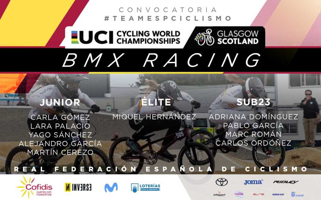 En BMX Racing, el equipo español estará integrado por un bloque de 10 pilotos: Carla Gómez, Lara Palacio, Yago Sánchez, Alejandro García y Martín Cerezo, pertenecientes a la categoría Junior; Adriana Domínguez, Pablo García, Marc Román y Carlos Ordóñez de la categoría sub23; y como único élite Miquel Hernández. Las clasificatorias y finales de BMX Racing se disputarán el 12 y 13 de agosto.