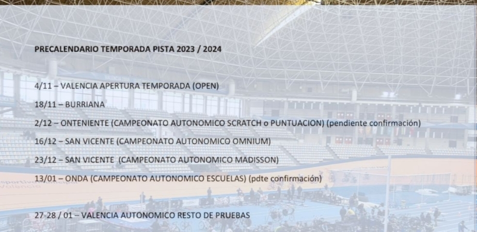 La Federación de Ciclismo de la Comunidad Valenciana (FCCV), tras la reunión de la Comisión de Pista, ha hecho oficial el precalendario de pruebas para la temporada 2023/2024. En principio son siete, aunque podrían ser alguna más. Ontinyent acogerá el Autonómico de Scratch; San Vicente, los de Ónmiun y Madison; València, el del resto de pruebas; y, Onda, el de Escuelas.