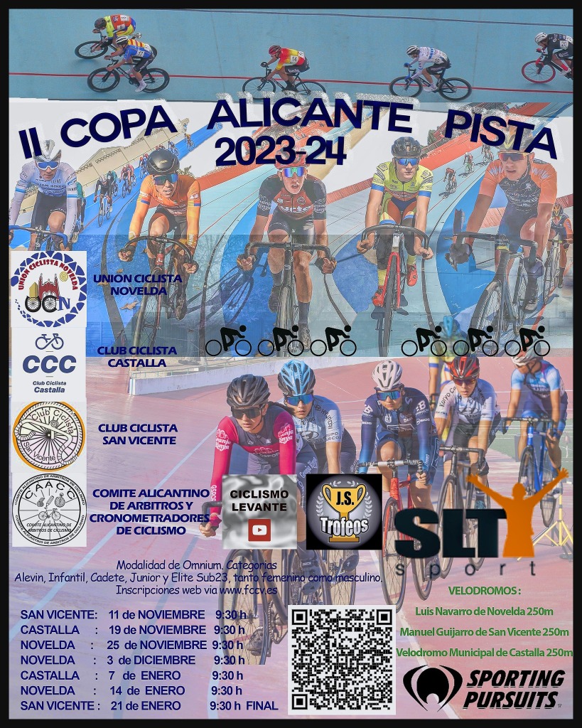 A dichas competiciones hay que añadir, que no se reflejan en el comunicado, las que configuran la segunda edición de la Copa de Alicante de Pista 2023-2024 J. S. Trofeos-SLT SPORT-Sporting Pursuits que han diseñado la Unión Ciclista Novelda, el CC Castalla y el CC San Vicente, con el apoyo del Comité Alicantino de Árbitros. Dicha competición comenzará en el Velódromo de San Vicente el próximo 11 de noviembre y finalizará en el mismo recinto el 21 de enero y cuenta con siete pruebas que se disputarán en los recintos de las localidades de dichas entidades en la modalidad de Omnium (Scratch, Tempo, Eliminación y Puntuación).