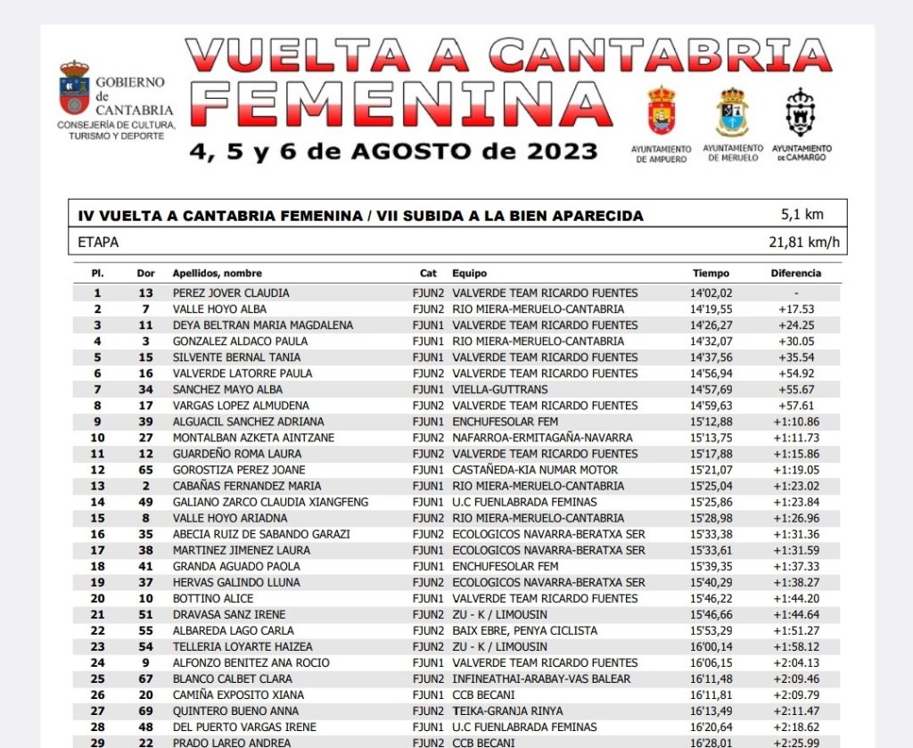 Claudia Pérez (Valverde Team) es la primera líder de la IV Vuelta a Cantabria Femenina, categoría júnior, tras imponerse hoy en la VII Subida Bien Aparecida, una cronoescalada de 5,1 kilómetros. Alba Valle (Rio Miera) ha sido segunda y Magdalena Deya (Valverde Team) ha completado el podio. Undécima plaza para Laura Guardeño (Valverde Team) y pusto 14 para Claudia Xiangfeng.
