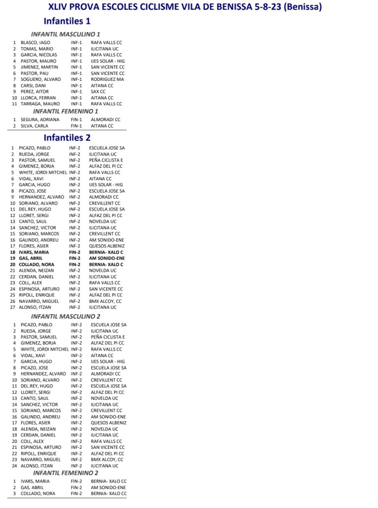 -Benissa. Clasificaciones