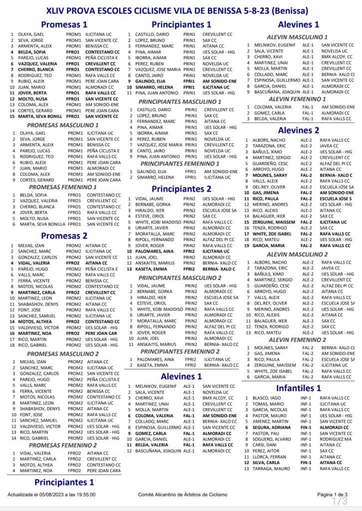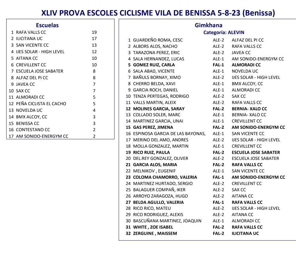 El Club Ciclista Rafa Valls se ha impuesto hoy en la XLIV Prova Provincial d’Escoles Ciclisme Vila de Benissa – Memorial Alejandro Jaén. La competición, organizada por el CC Benissa, se ha disputado en el Polígono Industrial La Pedrera y era puntuable para la Challenge de Escuelas de la FCCV. Segunda plaza para la UC Ilicitana y tercera para el CC San Vicente.