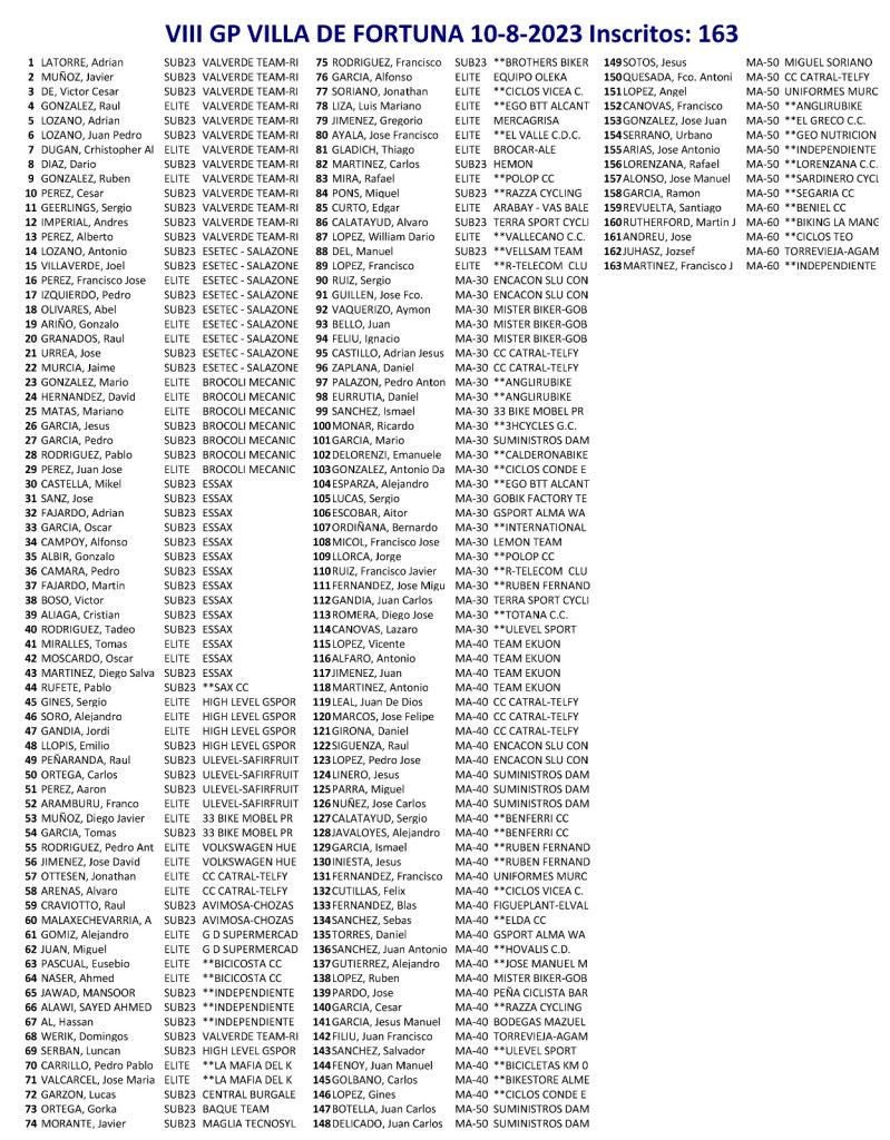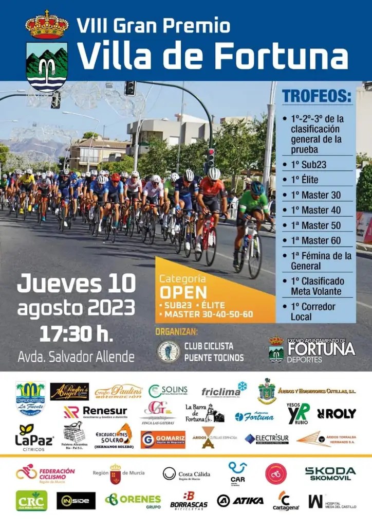 Hoy, día 10 de agosto, a partir de las 17.30 horas, se disputa el VIII Gran Premio de Ciclismo «Villa de Fortuna», categoría Open. Una prueba que se enmarcan en las fiestas patronales en honor a San Roque y que congrega a 200 ciclistas. Chicos y chicas de las categorías Sub23, Élite y Máster conformarán un pelotón muy numeroso. LISTA DE INSCRITOS.
