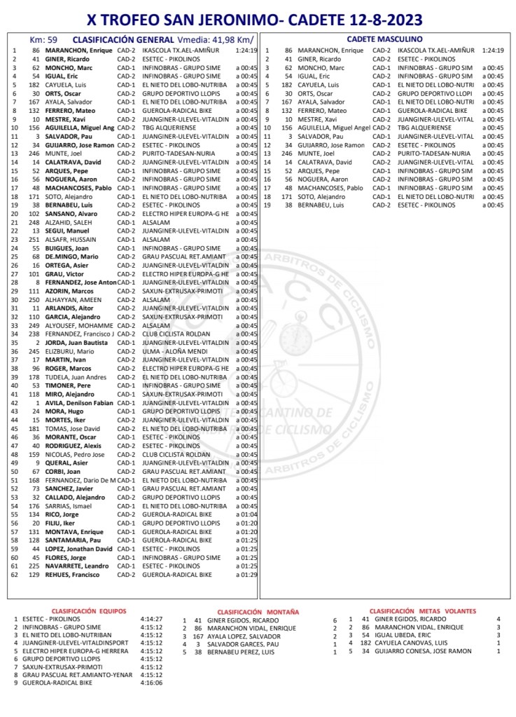 Enrique Maranchón (Ikascola) se ha impuesto esta mañana en el X Trofeo San Jerónimo para corredores cadetes disputado en Benferri. Ha entrado en meta acompañado de Ricardo Giner ( Esetec Pikolinos). Marc Moncho (Lucta-Granja Rinya) ha dado tiempo al pelotón, a 45 segundos.