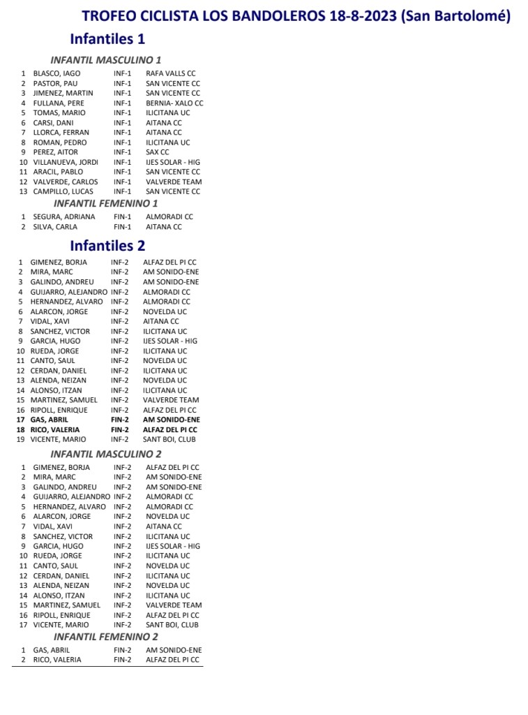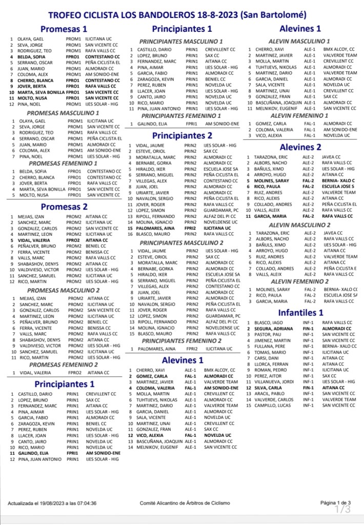 San Bartolomé ha sido el escenario esta tarde del I Trofeo Ciclista Peña Los Bandoleros de la categoría de Escuelas y puntuable para la Challenge de la Provincia de Alicante. La victoria la ha conseguido el CC Almoradí, por delante del CC San Vicente y de la UC Ilicitana.