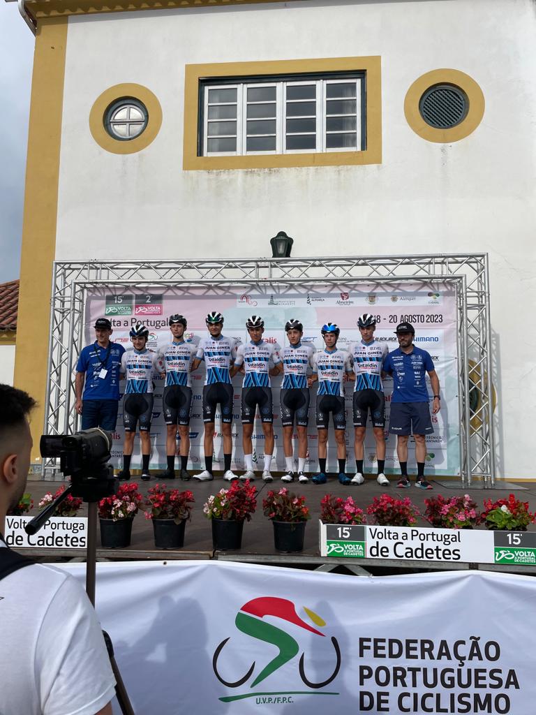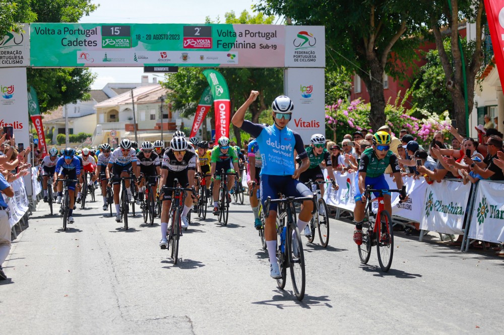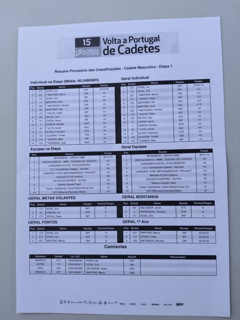 Leo Ucher (UC Fuenlabrada/SantBoi) es el primer maillot amarillo de la Volta a Portugal de Cadetes, tras imponerse hoy al sprint en la etapa inaugural de la competición, de 82,8 kilómetros, entre Santarém y Benavente. La fuga más consistente unió a tres corredores al frente de la carrera: Ivo Ribeiro (Paredes/Fortunna), Pepe Arqués (Infinobras/Grupo SIME) y Ricardo Caria (Escuela de Ciclismo Viseu). El corredor del equipo viseense se quedó atrás por culpa de la avería, mientras que los otros dos compañeros de aventura serían alcanzados ya en la aproximación al premio de montaña situado dentro de los diez kilómetros finales.